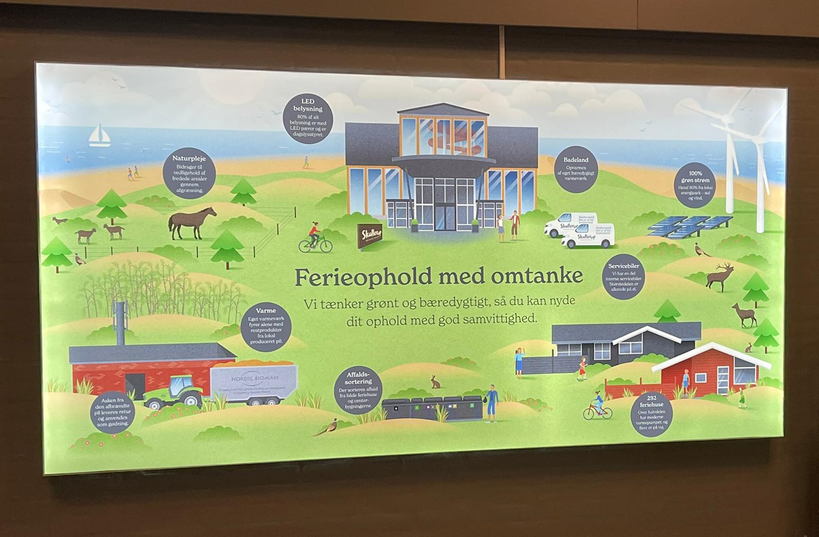 I aktivitetscenteret designede Tankegang et stort oversigtsbillede, der visualiserer resortets mange bæredygtighedstiltag. Billedet er placeret et sted, hvor gæster naturligt holder pause – og derfor er mere åbne for at tage informationen ind.