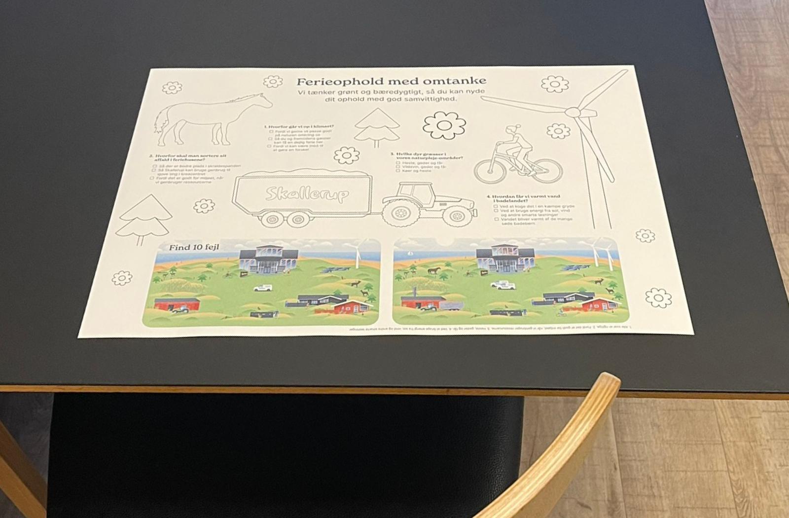 I resortets restaurant fandtes allerede et dækkeservietkoncept til børn, hvor de kunne farvelægge en tegning. Tankegang fornyede indholdet, udvidede målgruppen og gav det et nyt lag: en fortælling om resortets bæredygtige handlinger.
