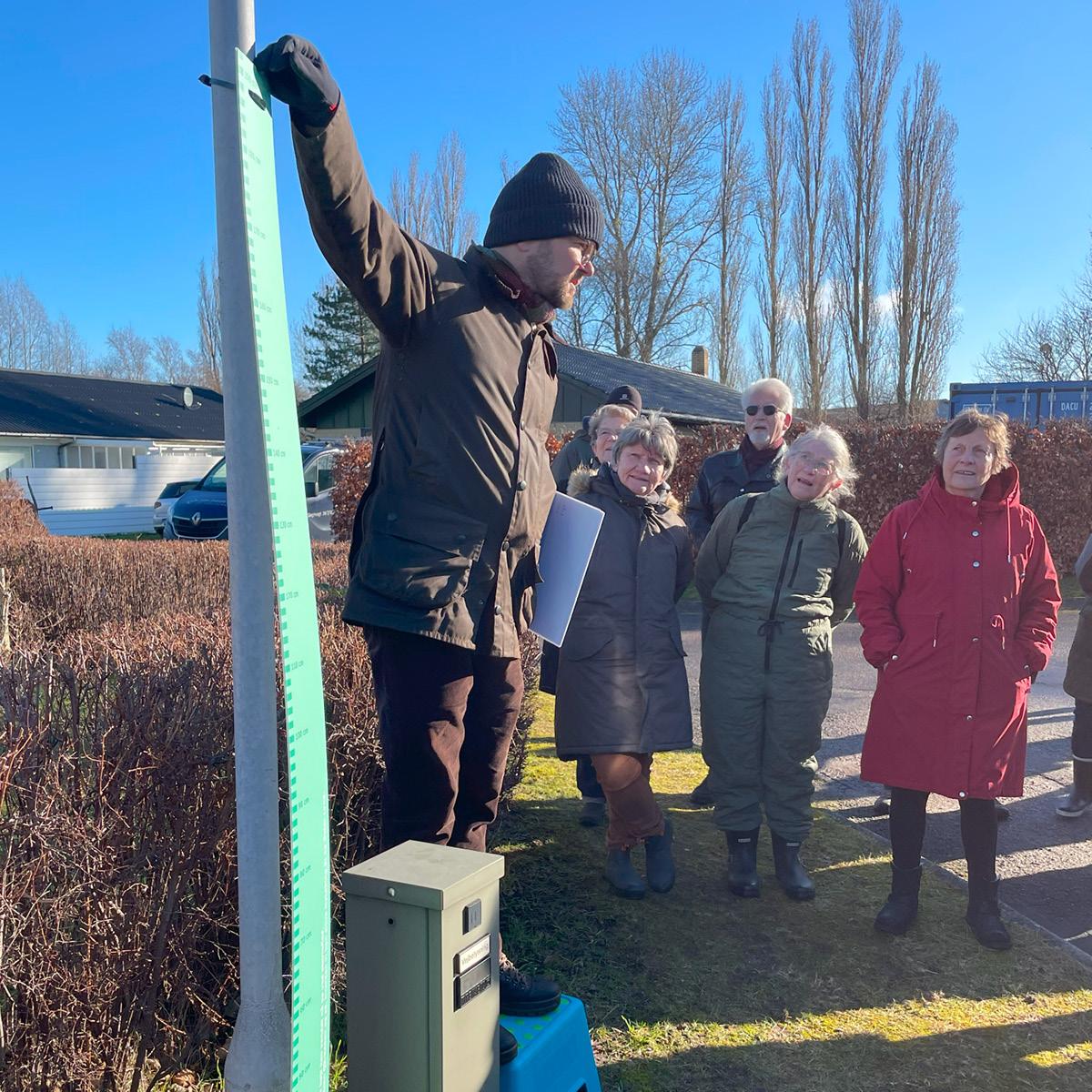 I de berørte områder, opsatte vi målepinde ved lygtepæle, som viste, hvor højt vandet vil nå, hvis en stormflod går over det gamle dige. Samtidig opstillede vi svaner på pæle, som markerede, hvor højt over jorden, svaner ville svømme rundt efter en stormflod. Mens målepindene viste oversvømmelsen faktuelt, gav svanerne stor opmærksomhed ved at gøre vandstanden håndgribelig.