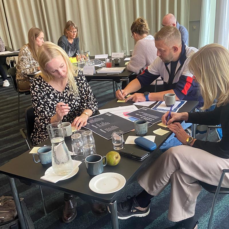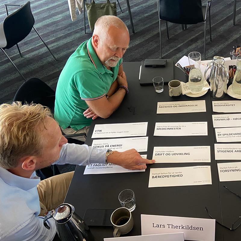 Første trin var en interviewrunde, hvor Tankegang talte med medarbejdere og ledere i KLAR Forsyning samt med ledere fra de fire ejerkommuner, Køge, Greve, Solrød og Stevns. Det var input til bestyrelsen, som vi samlede til en dags visionsworkshop med øvelser og masser af lange, grundige samtaler om udfordringer og muligheder.
