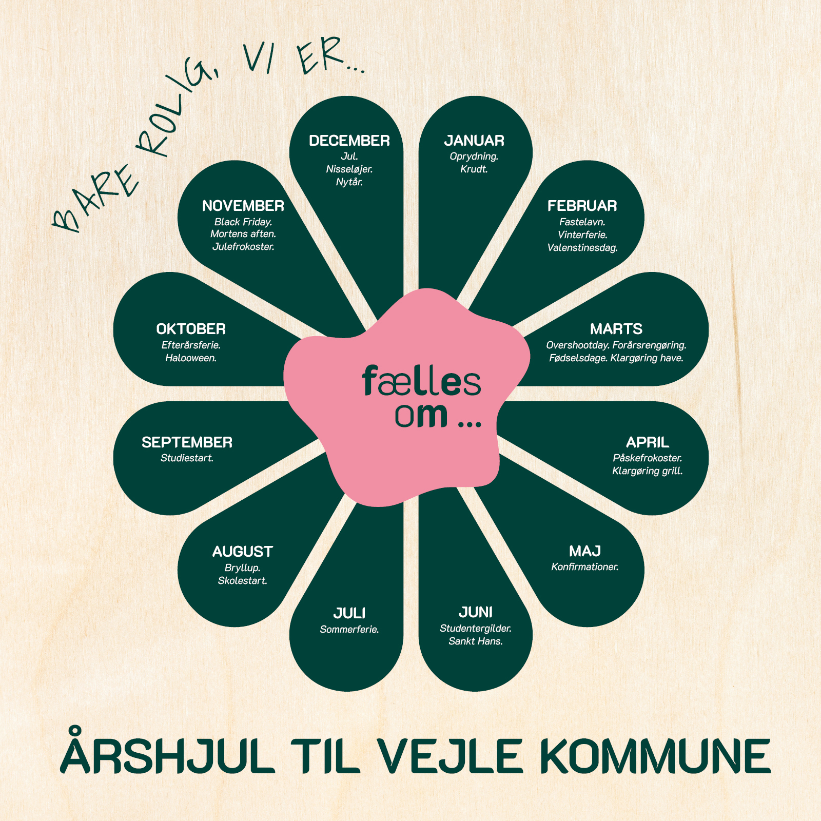 Tankegang og Vejle RG startede med at kortlægge borgernes hverdag i et årshjul: Hvad sker der hvornår, og hvilket affald følger med? På den måde blev det tydeligt, hvilke sorteringstips der giver bedst mening på bestemte tidspunkter. Fx når gavepapiret hober sig op i juletiden.