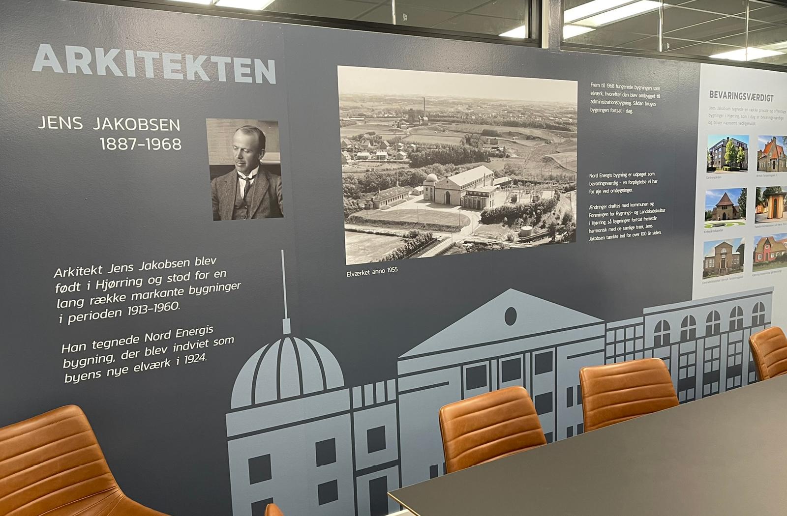Nord Energi er et stolt, historisk andelsselskab med en lang fortælling om visionære grundlæggere, vinterstorme og digital udvikling. I 2025 gennemgik det gamle hovedkontor en omfattende renovering, og i den forbindelse opstod ønsket om at opdatere den historiske tidslinje og gøre selskabets historie mere synlig og levende i bygningen. Dengang var tidslinjen placeret på en væg i et gangareal.